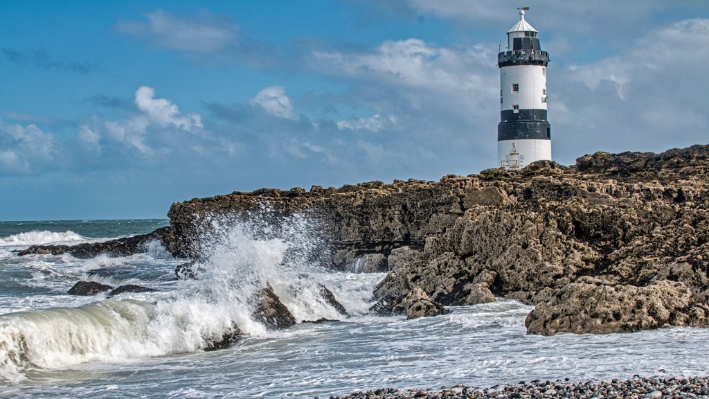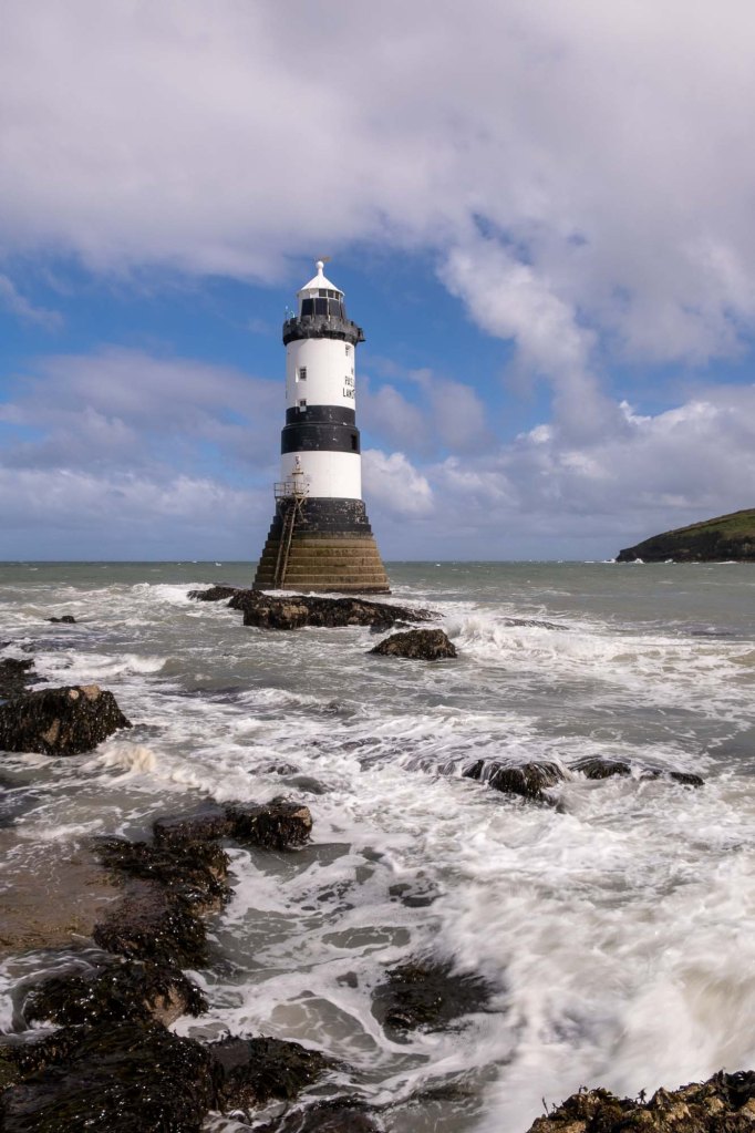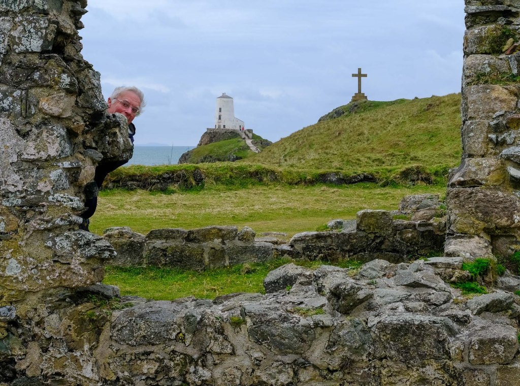 The cars met up at St Seirol’s Church and Monastry and we wandered around this church and graveyard, abbey ruins and empty dovecote finding interesting ways of capturing the relics, crosses, gravestones and even each other. Then we had to pay the toll man the princely sum of £3.50 per car to allow the cars to cross a small bridge and drive to Penmon Point with its Trwyn Du Lighthouse, cottages and snackshack, surrounded by a pebble beach and rock formations. The tide was on its way in, but the lighthouse was well revealed and despite being very windy this seemed to be blowing the clouds away to reveal signs of blue sky and sunshine.